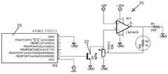 图2中的示意图向图1的基本刺激器电路20中添加控制组件。由一个ATtiny13微控制器24(加利福尼亚州圣何塞爱特梅尔公司(Atmel Corporation,San Jose,CA))或类似装置的脉宽调制(PWM)输出(MOSI(主输出/从属输入,引脚5)供电的晶体管22可用以控制刺激器的增益。PWM使得晶体管将或多或少的进入运算放大器12(引脚2)的电压汲取到地线,因此调节流动穿过头皮的电流的量。