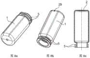 Fig. 6a to 6c show schematic representations of acartridge 1 of a cartridge system of a system according to an exemplary second embodiment. It can be seen that thecapsule 2 comprises a bottle-shaped object with rounded edges, flattened longitudinal sides and a capsule opening on the side opposite the bottom area 7 along the longitudinal axis of thecapsule 1. In the region of the cassette opening, thecassette 1 has twocircumferential retaining flanges 5, to which thecassette receptacles 10 are clamped. The other part of the rounded or roundedbox 1 has a flattenedarea 29 on one side of thebox 1. A product identification identifier is preferably applied in the flattened area.