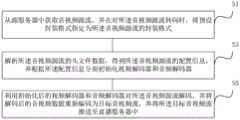 In a specific application scenario, an audio/video source stream with an encapsulation format determined as an FLV format may be obtained from a source server through an ffmpeg transcoding process. In this way, when the ffmpeg transcoding process transcodes the audio/video source stream, the encapsulation format of the mpeg transcoding process can be specified to be the FLV format, so that the time for protocol analysis is omitted. Then, the ffmpeg transcoding process receives the AAC header or AVC header of the audio/video source stream, so as to analyze parameters contained therein, such as an audio sampling rate, an audio channel number, a video frame resolution, a video frame rate, and a video format, respectively. In this way, the time waiting for loading of at least 40 frame data can be omitted. After extracting the corresponding configuration information from the AAC header and the AVC header, the audio decoder and the video decoder may be initialized using the configuration information, respectively. During initialization, if the configuration information does not include the video frame rate, the decoding frame rate of the video decoder can be set to a default value, so that transcoding abnormality is avoided. And starting a frame rate check thread in an asynchronous working mode during initialization, wherein the frame rate check thread can count the number of video frames acquired from the audio and video source stream within a specified duration. Then, the number of acquired video frames may be divided by the specified duration, thereby obtaining the number of frames transmitted in a unit time. The number of frames transmitted in the unit time can be the actual frame rate of the audio/video source stream. Then, the frame rate check thread may determine whether the calculated standard frame rate is consistent with a currently set decoding frame rate in the video decoder, and if not, it indicates that there may be an error in the frame rate analyzed from the video head file data, and at this time, the currently set decoding frame rate in the video decoder may be modified to the standard frame rate, so as to ensure that the decoding frame rate in the video decoder conforms to the actual frame rate of the audio/video source stream, thereby ensuring that the video decoding process can be performed smoothly. After the decoding process is completed, the decoded audio/video data can be encoded by using an X264 encoder with a tune zeroatency delay reduction parameter, so that a target audio/video stream that can be supported by the client is obtained. The target audio/video stream can be pushed to a streaming media server, and a subsequent client can acquire the transcoded target audio/video stream from the streaming media server.