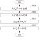 其中,X为待测物所在位置的横向尺寸、PC为第一摄影机的横向解析度、PW1为待测物对应的第一像素值、W1为待测物宽度。处理器撷取第一摄影机的横向解析度。影像辨识单元可识别待测物,以获得待测物对应的第一像素值。例如,辨识人脸所占范围,以得到人脸长、宽的像素值。接着,在步骤S507:决定待测物宽度。Wherein, X is the lateral dimension of the position of the object to be tested, PC is the lateral resolution of the first camera,PW1 is thefirst pixel value corresponding to the object to be tested, and W1 is the width of the object to be tested. The processor captures the lateral resolution of the first camera. The image recognition unit can identify the object to be tested to obtain the first pixel value corresponding to the object to be tested. For example, the range occupied by the face is identified to obtain the pixel values of the length and width of the face. Next, in step S507: determine the width of the object to be tested.