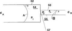 与此相似,参照图5,该图示出了经由不同宽度dA、dB的两个通路50、52之间接合处的截面,其中,将所有的壁面均看作是同样的材料,并且,平衡接触角θ不变,相应通路52、50内流体54、56的压力差ΔPA和ΔPB是指宽阔和狭窄部分内不流动性的单个值。在狭窄部分的入口处,用于止动的压力差由下式给出:Similarly, reference is made to Figure 5 which shows a cross-section through the junction between two
