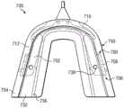 In some embodiments, theflange 706 can help maintain the shape of theouter rim 734. A moldable tray substantially surrounding the arch frame may allow for a reduction in material (bulk) between the user's incisors when the tray is inserted into the user's mouth. By providing a moldable tray with less material between the user's incisors, some embodiments may allow the user to better close their mouth with the tray inserted therein, which may improve comfort and/or effectiveness. In addition, the moldable tray substantially surrounding the arch-shaped frame may allow the moldable material to contact the inner surfaces of the user's mouth, such as the user's gums, lips, and tongue, only in certain portions of the mouth. Such a moldable tray may also allow for improved molding to the user's front teeth. Having thearch frame 700 substantially surrounded by themoldable tray 730 may also reduce the chance of damage to thearch frame 700 and may help hold any damaged portions of thearch frame 700 in place, preventing any such damaged portions from contacting the user's mouth or entering the user's airway.