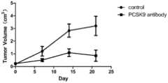 3. Preparing a PCSK9 antibody, injecting the antibody group into each nude mouse according to the dose of 10mg/g according to the body weight, and injecting the antibody group into tail vein; the control group was injected with the same volume of physiological saline, and each nude mouse was measured for tumor size every other week and continued to be injected with antibody treatment. And tumor size was measured, and the experimental procedure was repeated every week for one month continuously.