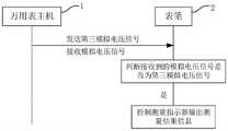 Referring to FIG. 7, in taking measurements,multimeter host 1 sends a third analog voltage signal having a voltage value within a third voltage value range to controlunit 23; the third voltage value range is the set voltage value range, and is greater than or equal to 0V and less than or equal to 2.5V. After receiving the analog voltage signal, thecontrol unit 23 determines whether the analog voltage signal is a third analog voltage signal, specifically, determines whether the voltage value of the analog voltage signal is within a third voltage value range. If so, themeasurement indicator 22 is controlled to output measurement result information.