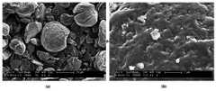 根据实施例1的负极活性材料的表面的1,000倍放大的SEM照片提供在图3的(a)中,且将图3的(a)中的表面的一部分放大的10,000倍放大的SEM照片提供在图3的(b)中。在图3的(a)和(b)中,明亮的白色部分表示异丙醇铝,且这里,具有约500nm的平均粒径(D50)的异丙醇铝清楚地存在于所述人造石墨的表面上。A 1,000 times magnified SEM photograph of the surface of the negative electrode active material according to Example 1 is provided in FIG. 3( a ), and a 10,000 times magnified SEM photograph of a part of the surface in FIG. 3( a ) is provided in In (b) of FIG. 3 . In (a) and (b) of FIG. 3 , bright white parts represent aluminum isopropoxide, and here, aluminum isopropoxide having an average particle diameter (D50) of about 500 nm clearly exists in the artificial graphite. on the surface.