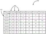 In an exemplary embodiment, the time, temperature, and voltage data for the battery may be stored in a file, database, or matrix that includes, for example, a voltage range on one axis and a temperature range on a second axis, wherein the cells of the table are configured to increment a counter in each cell to represent the amount of time the battery spends in a particular voltage/temperature state (i.e., forming a battery operation history matrix). The battery operation history matrix may be stored in the memory of thebattery monitoring circuit 120 and/or the remote device. For example, referring briefly to fig. 4B, the example batteryoperation illustration matrix 450 may includecolumns 460, each column representing a particular voltage or a range of voltage measurements. For example, a first column may represent a voltage range from 0 volts to 1 volt, a second column may represent a voltage range from 1 volt to 9 volts, a third column may represent a voltage range from 9 volts to 10 volts, and so on. The batteryoperation history matrix 450 may further includerows 470, each row representing a particular temperature (+/-) or a particular temperature measurement range. For example, a first row may represent a temperature below 10 ℃, a second row may represent a temperature range from 10 ℃ to 20 ℃, a third row may represent a temperature range from 20 ℃ to 30 ℃, and so on. Any suitable scale and number of columns/rows may be used. In an exemplary embodiment, the batteryoperation history matrix 450 stores a cumulative history of the amount of time the battery is in each specified voltage/temperature state. In other words, the batteryoperation history matrix 450 summarizes (or correlates) the amount of time that the battery is within a particular voltage/temperature range. In particular, such a system is particularly advantageous because the storage size does not increase (or only increases by a marginal amount) regardless of how long the data is recorded. The size of the memory occupied by the batteryoperation history matrix 450 that begins aggregating voltage/temperature data on the first day is typically the same as the size of the batteryoperation history matrix 450 years later or near the end of battery life. It will be appreciated that this technique reduces the size of the memory and the power required to store this data, thereby significantly improving the operation of thebattery monitor circuit 120 computing device, as compared to embodiments that do not use this technique. Furthermore, the battery voltage/temperature data may be periodically transmitted to a remote device. This effectively gates data and reduces the power required to store and transfer data, reduces the size of the memory, and reduces data transfer time relative to non-strobed techniques.