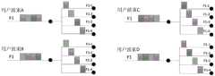It can be known from steps 1 and 2 that each gateway station manages a plurality of user sub-beams, assuming that the frequencies of signals entering the repeater system from the feed terminals of different gateway stations are all F1, when passing through the microwave quadruplex, F1 is divided into 4 sub-bands, the corresponding frequencies are respectively F1-1, F1-2, F1-3 and F1-4, the bandwidth corresponding to each frequency can be adjusted, and for convenience of description, the bandwidths of four channels after frequency division are defined to be the same. The same is done for F1 entering the repeater from the feed end of thegateway station 2, 3, 4, resulting in a feed forward shunt topology as shown in figure 4.