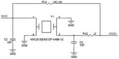 As shown in fig. 1 to 9, the crystal oscillator chip NXK25.000AE12F-KAB6-12 is a passive crystal oscillator of 25MHZ, and the crystal oscillator chips PIN1 andPIN 3 are crystal oscillator input and output respectively connected to XSCI/XSCO PINs of themain chip 1. The starting capacitance of the capacitor C2 and the capacitor C3 is 18 PF. The resistor R12 is an input-output coupling resistor, so that the reliable operation of the crystal oscillator is ensured.