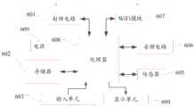 Audio circuitry 606, a speaker, and a microphone may provide an audio interface between a user and the electronic device. Theaudio circuit 606 may transmit the electrical signal converted from the received audio data to a speaker, and convert the electrical signal into a sound signal for output; on the other hand, the microphone converts the collected sound signal into an electrical signal, which is received by theaudio circuit 606 and converted into audio data, which is then processed by the audiodata output processor 608, and then passed through theRF circuit 601 to be sent to, for example, another electronic device, or output to thememory 602 for further processing. Theaudio circuitry 606 may also include an earbud jack to provide communication of a peripheral headset with the electronic device.