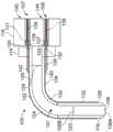 第一柔性基板102从第一配合端118延伸到第一端接端120。在一个示例实施例中,第一柔性基板102是柔性印刷电路板(PCB)。在第一配合端118和第一端接端120之间,第一柔性基板102在第一位置(图1)至第二位置(图2)之间弯曲或挠曲。在一个示例中,当电气装置100处于第二位置(图2)时,电气装置100是直角插头。因此,第一柔性基板102包含包括配合端118的配合部分122、弧形部分124以及包括端接端120的端接部分126。当由柔性基板材料形成时,在一个实施例中,配合部分122和端接部分126都保持大致上笔直,而弧形部分124在第一位置(图1)保持笔直并在第二位置(图2)弯曲或具有弧形。The first