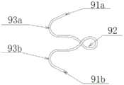 本实施例的锚定针采用回转结构,如图12-13所示,材质为记忆合金。锚定针在输送过程中装载于输送管内,头端的两个分支第一头端91a和第二头端91b被输送管约束至轴向方向,当到达预定位置后推动推送杆,锚定针头端分支91a和91b即刺入目标位置,锚定针中间部位回转形成拉环92,可供收紧线3穿过多个锚定件进项收紧。当完成铆入后,头端分支第一头端91a和第二头端91b恢复至初始状态下的钩状结构:第一钩状结构93a和第二钩状结构93b,如图13所示。此时由于扩展形状具有明显大于收缩形状的横截面,同时锚定针是刚性的,可将锚定针固定在人体组织内部。The anchoring needle in this embodiment adopts a rotary structure, as shown in Figures 12-13, and is made of memory alloy. The anchoring needle is loaded into the delivery tube during the delivery process, and the two branches of the head end, the first