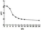 将培养24h的新鲜菌液以2.0%的接种量接种于MRS液体培养基中,37℃恒温厌氧培养。分别于0、2、4、6、8、10、12、14、24h利用pH计测定培养液pH值,根据测定结果绘制产酸性能曲线,结果如图4所示。由图可知,培养液的pH变化趋势与生长曲线相一致,约氏乳杆菌ZJBF004接种后2h内pH下降缓慢,从6.22下降至6.16;2h后进入对数生长期,菌液pH快速下降至4.10;10h后菌液pH变化趋于平缓,稳定在3.92左右。The fresh bacterial liquid cultured for 24 hours was inoculated into MRS liquid medium with 2.0% inoculum, and incubated anaerobic at a constant temperature of 37°C. The pH value of the culture solution was measured with a pH meter at 0, 2, 4, 6, 8, 10, 12, 14, and 24 h, respectively, and the acid production performance curve was drawn according to the measurement results. The results are shown in Figure 4. It can be seen from the figure that the pH change trend of the culture solution is consistent with the growth curve. The pH of the Lactobacillus johnsonii ZJBF004 decreased slowly within 2 hours after inoculation, from 6.22 to 6.16; after 2 hours, it entered the logarithmic growth phase, and the pH of the bacterial solution dropped rapidly to 4.10. ; After 10h, the pH of the bacterial solution tended to be gentle, and was stable at about 3.92.