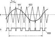 在这种设置中,现在将根据图27的PWM操作原理图,来描述PWM电路10的内部设置。在此图中,1001表示ΔI或初级电流指令值I*与初级电流检测值I之间的偏离,1002表示用于斩波ΔI的三角波,且1003表示开关信号一它作为所述ΔI与三角波之间的比较结果,当ΔI大于该三角波时导通且当ΔI小于该三角波时关断。该三角波的周期一般被称为PWM频率且在下面被称为“fpwm”。这些装置,诸如装在逆变器电路4中的功率晶体管,(以下称为“开关装置”)在这种开关信号1003的控制下被通—断。In this arrangement, the internal arrangement of the