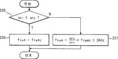 图6是根据本发明的第二实施例的用于驱动马达的逆变器控制设备的操作流程图。现在结合图6描述由恒定力矩—恒定输出PWM切换电路15进行的操作的流程图。首先,在步骤205判定马达速度ωr是否小于ωb。如果该速度小于ωb,则在步骤206将fpwm设定为fpwm0=10—20kHz。如果该速度不小于ωb,则在步骤207,在fpwm>3kHz的条件下,将fpwm设定为(ωb/ωr)×fpwm0。6 is an operation flowchart of the inverter control device for driving a motor according to the second embodiment of the present invention. A flowchart of the operation performed by the constant torque-constant output