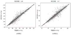 (6)将PPG信号输入到上述步骤中即可得到单拍脉搏波对应的血压值,实施结果图6(a)为收缩压的相关性分析,图6(b)为舒张压的相关性分析。(6) Input the PPG signal into the above steps to obtain the blood pressure value corresponding to the single beat pulse wave. Figure 6(a) is the correlation analysis of the systolic blood pressure, and Figure 6(b) is the correlation analysis of the diastolic blood pressure. .