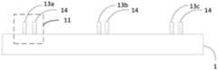 图3示出的是本发明提供的模拟内存拉载板的示意图。如图3所示,模拟内存拉载板1的一端包括多组连接条11,另一端由于与内存条插槽连接,可以将PIN脚与主板的内存条插槽的PIN脚定义一致,设计时可以采用金手指设计。在一些实施方式中,所述模拟内存拉载板的每组连接条均包括电源连接条和地连接条,每组的电源连接条和地连接条之间的距离相同。如图3所示,模拟内存拉载板1包括三组连接条,但这只是示例性的,在其他实施例中可以采用其他数量的连接条,每组连接条均包括一个电源连接条和一个地连接条。在一些实施方式中,同一个模拟内存拉载板上的不同组连接条中的电源连接条对应的电源类型不同。本实施例中的电源连接条分别为VDD、VTT和VPP,分别在图中以13a、13b和13c表示,地连接条以14表示。FIG. 3 is a schematic diagram of a simulated memory loading board provided by the present invention. As shown in Figure 3, one end of the analog