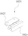 Specifically, referring to fig. 22, in the embodiment of the present application, theseventh transmission member 1624 includes afirst transmission seat 162e and asecond transmission seat 162f, thefirst transmission seat 162e and thesecond transmission seat 162f are located at two sides of thefifth transmission member 1623, and thefirst transmission seat 162e is disposed near the edge of thefirst plate 142. The inner walls of thefirst transmission seat 162e and thesecond transmission seat 162f are provided with a thread groove corresponding to the thread strip of thetransmission part 162c, the thread strip is matched with the thread groove, and thetransmission part 162c is at least partially rotatably arranged between thefirst transmission seat 162e and thesecond transmission seat 162 f. When thefifth transmission member 1623 rotates, the engagement between thefifth transmission member 1623 and theseventh transmission member 1624 may convert the rotation of thefifth transmission member 1623 into an axial sliding movement of thefirst plate 142 on thefifth transmission member 1623, thereby adjusting the distance between thefirst plate 142 and therotating shaft assembly 12. In other embodiments, theseventh transmission element 1624 may be integrally embedded in thefirst plate 142, and may be glued or screwed to enhance stability.