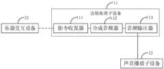 进一步地,以上实施例中的声音播放子设备12包括耳机、音响和扬声器等;无线连接包括蓝牙连接、WiFi连接、zigbee、2.4G等连接方式,本实施例不做限定。对应地,若采用无线连接的方式,指令收发器111和音频输出器113可以选用蓝牙模组、WiFi模组和zigbee模组、2.4G模组等设备。若采用有线连接的方式,指令收发器111和音频输出器113可以选用数据线或者总线等设备,本实施例不做限定。合成音频器112可以包括处理器和存储器,处理器与存储器相连。其中,处理器,用于调用并执行存储器中存储的程序,存储器,用于存储上述程序,该程序至少用于执行以下方法:根据控制信息调用本地的音频信息,或者,根据控制信息生成音频信息。处理器和存储器的型号可以根据实际情况进行选择。此处本实施例也不做限定。相对于现有技术中使用手机、平板、电视等智能设备对音频信息进行处理,本实施例采用专门的处理器对音频信息进行处理,不需要执行除了处理音频信息之外的其他任务,进而有效降低系统延迟。Further, the