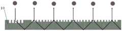 现有的衍射光波导结构光路,较多运用到的是表面浮雕光栅(Surfacereliefgrating,SRG)。表面浮雕光栅通常在基底上划刻光栅结构或者采用光刻的方式压印光栅结构,分为一维光栅和二维光栅。但是二者都是均匀光栅,光栅常数和光栅深度都是相同的,由于其自身的特性,在耦出区域的光线能量会沿着光线在光波导内部的传播方向(扩瞳方向)越来越低,导致出射的光线亮度不均匀,人眼就会看到一个明暗不同的图案,如图1所示,衍射光波导10耦出区域图像沿扩瞳方向亮度变化明显,图中上方圆点表示图像,明暗代表出射光线亮度大小。In the existing diffractive optical waveguide structure optical path, surface relief grating (SRG) is mostly used. Surface relief gratings are usually divided into one-dimensional gratings and two-dimensional gratings by scribing the grating structure on the substrate or imprinting the grating structure by photolithography. However, both are uniform gratings with the same grating constant and grating depth. Due to their own characteristics, the light energy in the outcoupling region will become more and more along the propagation direction (pupil dilation direction) of the light inside the optical waveguide. If the value is low, the brightness of the outgoing light is uneven, and the human eye will see a pattern with different brightness and darkness. As shown in Figure 1, the brightness of the image of the outcoupling area of the diffractive