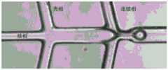 At the downstream of the liquid drop production unit, the micro-particles pass through a distance standard channel, namely an output channel 7 (B-7), and then enter a partial resistance control unit 8 (B-8), taking an expansion cavity as an example, because the size of the expansion cavity has a certain size difference with that of a common channel, the microgel expands to be spherical at the moment, and is further solidified and shaped, and simultaneously continuously migrates in the expansion cavity; meanwhile, the flow rate of the liquid phase is still kept at a higher level based on the size limitation, so that the microgel can be prevented from being blocked in the channel, and the channel is kept unblocked.
