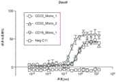 “功能性Fc区”具有天然序列Fc区的“效应子功能”。效应子功能的非限制性实例包括C1q结合;CDC;Fc受体结合;ADCC;ADCP;细胞表面受体(例如,B细胞受体)的下调等。此类效应子功能一般要求Fc区与受体(例如,FcγRI;FcγRIIA;FcγRIIB1;FcγRIIB2;FcγRIIIA;FcγRIIIB受体以及低亲和力FcRn受体)相互作用;并且可使用本领域已知的各种测定法进行评估。“死亡”或“沉默”的Fc是已突变以保留关于例如延长血清半衰期的活性,但不活化高亲和力Fc受体或对Fc受体的亲和力降低的Fc。A "functional Fc region" has the "effector functions" of a native sequence Fc region. Non-limiting examples of effector functions include Clq binding; CDC; Fc receptor binding; ADCC; ADCP; Such effector functions generally require the Fc region to interact with a receptor (e.g., FcyRI; FcyRIIA; FcyRIIB1; FcyRIIB2; FcyRIIIA; FcyRIIIB receptors and low affinity FcRn receptors); and various assays known in the art can be used to evaluate. A "dead" or "silent" Fc is one that has been mutated to retain activity with respect to, for example, increased serum half-life, but does not activate high affinity Fc receptors or has reduced affinity for Fc receptors.