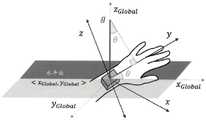 基于姿势的特征:在步态(即,跑步或步行)期间,腕部通常具有特定的可预测姿势,而在非步态周期期间,姿势主要是不可预测且不规则的。因此,提取有关腕部姿势的信息对于步态回合检测应该是有用的。将θ定义为腕部上的加速度计的y轴与地球水平面<xGlobal,yGlobal>(由地球坐标系的x轴和y轴构成并且垂直于重力向量的平面,参见图2)之间的角度。假设传感器只能绕腕部转动,传感器的y轴几乎与腕部的纵轴对齐。根据图2,并且如果腕部移动的动态加速度保持较低,则重力向量在加速度计的y轴以及由传感器的x轴和z轴定义的平面(<x,z>)上的投影为:Posture-based features : During gait (i.e., running or walking), the wrist typically has a specific predictable posture, while during non-gait cycles, the posture is mostly unpredictable and irregular. Therefore, extracting information about wrist poses should be useful for gait bout detection. Defineθ as the distance between they -axis of the accelerometer on the wrist and the Earth's horizontal plane <xGlobal ,yGlobal > (the plane formed by thex- andy -axes of the Earth coordinate system and perpendicular to the gravity vector, see Figure 2) angle. Assuming that the sensor can only rotate around the wrist, they -axis of the sensor is almost aligned with the longitudinal axis of the wrist. According to Figure 2, and if the dynamic acceleration of the wrist movement is kept low, the projection of the gravity vector on they -axis of the accelerometer and on the plane (<x ,z >) defined by thex- andz -axes of the sensor is: