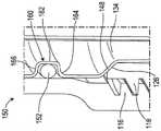 The middle portion of thehousing 102 includes afirst coupling member 148 on its outer surface. In some arrangements, thefirst coupling member 148 includes a female end of a male-female coupling member pair configured to receive a corresponding male coupling member (e.g., thesecond coupling member 126 of the adapter 106). A sealingmember 152 is disposed between thefirst coupling member 148 and the housingfirst end 136, the sealingmember 152 providing a radial seal with thehousing 102 and thefilter head 108. Theportion 150 of thefiltration system 100 that supports the sealingmember 152 is a sealingmember channel 160. The sealingmember channel 160 includes afirst retaining lip 166, aretaining wall 162, and asecond retaining lip 164. Thefirst retaining lip 166, retainingwall 162, and second retaininglip 164 form a 90 degree rotated "U" shaped channel in thehousing 102. In some embodiments, the sealingmember 152 is a circular ring (e.g., ring) radial sealing member.