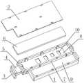 When in use, the output port is connected with the waveguide, in practice, themain body 1 is provided with an input port communicated with the cavity, and an input signal is processed by the circuit board and then output to the waveguide by the microstrip plate and themicrostrip probe 24. The microstrip board and themicrostrip probe 24 are integrated and switched, the microstrip probe is suitable for high-power transmission, welding is not needed in the structure, loss is reduced, power capacity is improved, and uncertain factors such as overlarge reflection caused by welding are avoided. In practice, the output port is arranged in a gradually-changing transition mode from one end close to the cavity to one end far away from the cavity from small to large to form a microstrip waveguide gradually-changing conversion structure, and the microstrip waveguide conversion can transfer electromagnetic field energy transmitted by the microstrip line into the waveguide cavity for transmission. The traditional microstrip waveguide conversion is to design and convert a microstrip line probe and a standard structure waveguide, and the microstrip line probe and the gradual change waveguide are converted to be finally transited to a standard port rectangular waveguide from a small port, so that the processing can reduce the slotting size of the waveguide at the probe, reduce the contact area of a microstrip plate and the waveguide port, avoid the deformation of the microstrip plate under stress and improve the reliability of equipment. In addition, a layer of ultrathin polytetrafluoroethylene is padded above the microstrip plate and the waveguide port, so that the microstrip plate can be isolated from the outside air, and the microstrip plate is prevented from being oxidized due to exposure to the air for a long time.