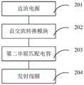其中,直流电源201用于提供充电电能。直交流转换模块202与直流电源201连接,用于接收直流电源201输出的直流电,并将接收到的直流电转换为交流电输出。第二串联匹配电容203和发射线圈204连接组成振荡电路,该振荡电路与直交流转换模块202连接,用于接收直交流转换模块202输出的交流电,并将交流电供给发射线圈204。通过发射线圈204与接收线圈101的耦合作用,将发射线圈204的功率传输给接收线圈101。Wherein, the