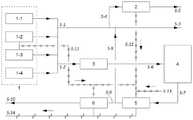在电价相对较高的用电高峰阶段(一般为9点至21点),尤其是尖峰阶段,空气压缩机的备机1-1仍保持停运状态,其他三台空气压缩机(1-2、1-3、1-4)通过部分停止运行或者低负荷运行来减少压缩空气输出量,其中第一压缩空气S-1的输出量小于空分装置的空气需求量,第二压缩空气S-2停止向储能装置输出,储能压缩机3停止运行;高压空气储罐4向高压透平及发电机5输出第二高压储能空气S-7,经膨胀发电后形成两股0.50~0.70MPaG的压缩空气,即第五压缩空气S-8和第六压缩空气S-9;第五压缩空气S-8送往空分装置,S-1和S-8的总流量等于空分装置的空气需求量,大幅减少高成本电能的消耗;同时,第六压缩空气S-9送往低压透平及发电机6,经膨胀发电后形成常压外排空气S-10;与此同时,空气压缩机副产热S-11、空气增压机副产热S-12以及低温热源S-13,按照实际需求量送往高压透平及发电机5和低压透平及发电机6,通过加热储能空气来提高发电效率;在此间期间,高压透平及发电机5和低压透平及发电机6产生的电能S-14送往电网或者企业附近的大型电驱动设备,实现用电负荷的削峰填谷。In the peak period of electricity consumption (usually from 9:00 to 21:00) when the electricity price is relatively high, especially in the peak period, the standby machine 1-1 of the air compressor remains out of operation, and the other three air compressors (1-2 , 1-3, 1-4) Reduce the output of compressed air by partial shutdown or low-load operation, wherein the output of the first compressed air S-1 is less than the air demand of the air separation unit, and the second compressed air S- 2 Stop the output to the energy storage device, and the