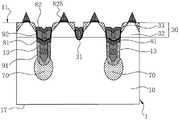 附图标记: 1、漏极衬底;10、漏极外延层;11、处理表面;12、背面;13、第一沟槽;14、表面酸化膜;15、主体区;16、漏极金属垫; 17、参杂浓度清晰变化水平面;20、源极延伸倒鳍; 30、有源层;31、第二沟槽;32、沟道层;33、源极领域结;34、欧姆接触层; 41、第一栅极;42、第二栅极;50、内介电层; 60、源极层;70、浮空反极型柱底结; 81、第一隔离氧化层;82、第二隔离氧化层; 81A、第一硬掩膜层;82B、自对准掩膜体; 91、第一效应氧化层;92、第二效应氧化层。Reference numerals: 1. Drain substrate; 10. Drain epitaxial layer; 11. Treated surface; 12. Back surface; 13. First trench; 14. Surface acidizing film; 15. Body region; 16. Drain metal Pad; 17. The level of doping concentration changes clearly; 20, the source extends the inverted fin; 30, the active layer; 31, the second trench; 32, the channel layer; 33, the source field junction; 34, the
