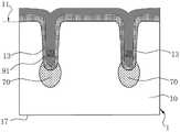 关于漏极外延层10内部结构的一种具体化,在较佳示例中,所述漏极外延层10在对应所述第一沟槽13底部的部位还形成有深植入区,以形成屏蔽栅底部浮空反极型柱底结70。屏蔽栅底部浮空反极型柱底结70由所述源极延伸倒鳍20的底部透出,以增加浮空反极型柱对临近的极型柱的电荷平衡,避免不同区所述源极延伸倒鳍20之间的电子流提早汇集,在制作上可以减少所述第一沟槽13的深度,底部绝缘层厚度也能减少,也有利于所述源极延伸倒鳍20的填充形成。示例中,反极型柱底结70为P型掺杂;反极型柱底结70是作用于提高源极延伸倒鳍20的分流隔离作用,防止电子流在漏极外延层10内提早汇集;故相同性能下第一沟槽13的槽深度可以减少,降低源极延伸倒鳍20填槽的填充难度。示例中,反极型柱底结70的底部深度不超过所述漏极外延层10的厚度,使所述漏极外延层10在所述第一沟槽13之间不被所述反极型柱底结70完全阻隔,反极型参杂物质不会进入漏极衬底1,在制造工艺中保持图中参杂浓度清晰变化水平面17的存在,使竖立沟道式场效晶体管具有较好的产品稳定性。Regarding an embodiment of the internal structure of the