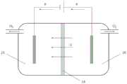 Fig. 2 is a working schematic diagram of an electrolytic cell, and in the water electrolysis hydrogen production system, the electrolytic cell adopts an acid-base mixed water electrolysis technology using a ceramic lithium ion exchange membrane as a diaphragm. The electrolytic cell is divided into acathode chamber 15 and ananode chamber 16 with aceramic diaphragm 14 as a boundary. As shown in fig. 3, theceramic membrane 14 haslithium ion channels 17 for selectively passing lithium ions, and thesupport 18 ensures that the ceramic membrane does not collapse. The water electrolysis technology can be driven by the waste lithium ion battery to generate hydrogen evolution reaction without generating hydrogen and oxygen mixing phenomenon.