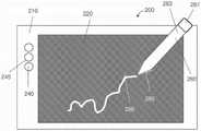 图2示出了包括磁驱动介质的可写平板电脑200。可写平板电脑200包括封装的磁电泳显示器220和与显示层相互作用的触控笔280。如图2所示,可写平板电脑200类似于传统的电子可写平板电脑,包括外壳210和界面控件240,其可以是真实的或虚拟的。当用户用触控笔280在可写介质220上“书写”时,由此产生对应于其中磁性颜料粒子已被链接(如上所述)的囊体区域的“笔划”290。在一些实施例中,触控笔的“笔划”也可以由与触控笔相互作用的数字化层记录,例如通过感应信号。如图2所示,触控笔产生深色背景上的白色的“笔划”290。然而,这不是限制性的,因为也可以通过使用白色磁性颜料或通过在书写之前将非磁性白色颜料驱动到书写表面来在白色背景上书写黑色。FIG. 2 shows a