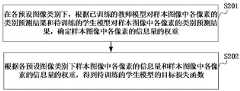 In an actual semantic segmentation scene, semantic segmentation is a dense classification task, classification difficulty degrees of different parts of an object are different, most parts in a sample image are relatively simple and easily-segmented parts, and the quantity of information contained in the sample image is small, so that a distillation loss function is basically dominated by the simple parts, the gradient is small, and pixels of a small part which is really rich in information in the sample image are suppressed. Because more pixels are likely to be background images and less pixels are figures and article images which need to be accurately identified, the difference of the teacher model and the student model in the prediction result is considered, the weight of the pixels in each preset image category is adjusted through the information quantity, and the student model has higher prediction accuracy on the pixels with higher information quantity.