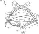 图4A-4D是根据一些示例性实施例的具有交叉后支撑系带的自适应胸罩400的图示。自适应胸罩400提供了包括右调节器405A和左调节器405B的另一种自适应支撑结构的图示,其可以用自适应调节引擎代替。自适应胸罩400还包括图4B所示的后系带罩410。图4C和4D示出了后系带覆盖物410被拉回的后自适应支撑结构。后自适应支撑结构包括系带415、绑带滑轮420、调节引擎425、调节器430和下条带435。在这个例子中,系带415在自适应胸罩400的后部分形成交叉图案,从沿着下条带定位的调节引擎425延伸到肩带上的锚固点。系带415穿过自适应胸罩400两侧的一系列绑带滑轮420。绑带滑轮420锚固在提供下条带和鸡心位类型调节的位置。后自适应支撑结构也锚固在肩带上,以通过肩带同时提供提升支撑。4A-4D are illustrations of an