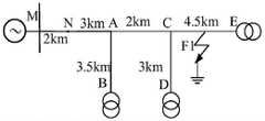 在PSCAD仿真软件上搭建如图2所示的10kv配电网多分支线路模型,设置0.1ms时在C点右侧2.5km的F1处发生单相接地故障,接地电阻为5Ω,线路波速为2.98285×105km/s,采样率为10MHz,在M端(即配电线路的发送端)及各分支点、线路末端检测故障电压行波波形。The multi-branch line model of the 10kv distribution network shown in Figure 2 is built on the PSCAD simulation software. When the setting is 0.1ms, a single-phase ground fault occurs at F1, 2.5km to the right of point C, the grounding resistance is 5Ω, and the line wave speed is 2.98285 ×105km/s, the sampling rate is 10MHz, and the fault voltage traveling wave waveform is detected at the M end (ie, the transmitting end of the distribution line), each branch point, and the end of the line.