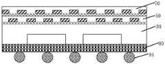 In the specific preparation process of thefirst shielding layer 40, under the condition of 2500 rpm, a silver nanowire ethanol suspension with a concentration of 100mg/ml of silver nanowires is spin-coated, then heat treatment is carried out for 15 minutes at 105 ℃ to form a first metal nanowire layer, then a photoresist material is coated on the first metal nanowire layer, a photoresist mask is formed through an exposure and development process, electroplating copper treatment is carried out by utilizing the photoresist mask to form a plurality of first copper bumps arranged in an array, the first copper bumps are round or square, the side length or diameter of each first copper bump is 100-1000 microns, the size of a first gap adjacent to each first copper bump is 300-600 microns, and then the silver nanowire ethanol suspension with a concentration of 120mg/ml of silver nanowires is spin-coated under the condition of 1500 rpm, and then, carrying out heat treatment at 105 ℃ for 15 minutes to form a second metal nanowire layer, wherein the first metal nanowire layer, the plurality of first copper bumps arranged in an array and the second metal nanowire layer together serve as afirst shielding layer 40, and thefirst shielding layer 40 has excellent bending performance.