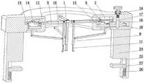 为了便于将圆形环1更好固定在手术台上,所述的圆形环1左右两侧分别设有上下方向的固定板24,固定板24内侧开设有开口朝下的固定槽25,固定槽25侧壁上开设有上下方向的滑道26,固定槽25内设有左右方向且可上下滑动的T形夹板27,T形夹板27外端伸入其对应侧的滑道26内且与滑道26滑动连接,T形夹板27下侧经上下轴向的弹簧28与滑道26滑动连接。In order to better fix the