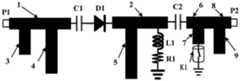 本实施例中,信号倍频电路包括第一微带线1、第二微带线2、第三微带线3、第四微带线4、第五微带线5、第一电容C1和肖特基二极管D1;第一微带线1和第二微带线2分别沿从左向右方向横向设置,第一微带线1位于第二微带线2的左侧,第一微带线1沿左右方向的中线所在直线与第二微带线2沿左右方向的中线所在直线重合,第三微带线3和第四微带线4分别沿从前往后方向纵向设置,第三微带线3和第四微带线4按照从左往右的顺序间隔分布;第一微带线1沿左右方向的长度为22.7mm,第一微带线1沿前后方向的长度为3mm,第二微带线2沿左右方向的长度为15mm,第二微带线2沿前后方向的长度为3mm,第三微带线3沿左右方向的长度为3mm,第三微带线3沿前后方向的长度为8.4mm,第四微带线4沿左右方向的长度为3mm,第四微带线4沿前后方向的长度为8.5mm,第五微带线5沿左右方向的长度为3mm,第五微带线5沿前后方向的长度为17.5mm,第一微带线1的左端通过第一SMA母头同轴连接器P1与射频接收器的输出端连接,信号倍频电路通过第一微带线1接入射频接收器输出的射频驱动信号,第三微带线3和第四微带线4位于第一微带线1的后侧,第三微带线3的前端和第四微带线4的前端分别与第一微带线1的后端连接,第一微带线1的左端所在平面位于第三微带线3的左端所在平面的右侧,且两者之间的距离为4mm,第三微带线3的右端所在平面位于第四微带线4的左端所在平面的左侧,且两者之间的距离为8.7mm,第五微带线5位于第二微带线2的后侧,第五微带线5的前端与第二微带线2的后端连接,第五微带线5的左端所在平面位于第二微带线2的左端所在平面的右侧,且两者之间的距离为4mm,第一电容C1和肖特基二极管D1设置在第一微带线1和第二微带线2之间,第一电容C1的一端和第一微带线1的右端连接,第一电容C1的另一端和肖特基极管的正极连接,肖特基二极管D1的负极和第二微带线2的左端连接,第二微带线2用于连接信号分离电路。In this embodiment, the signal frequency multiplier circuit includes a first microstrip line 1, a