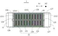 Further, in this embodiment, the connectingmember 12 further includes afirst side plate 122 and asecond side plate 123, theelastic body 121 has afirst side 1211 and asecond side 1212 which are oppositely disposed along the first direction A1, the dimmingassembly 1 includes two drivingunits 11, the two drivingunits 11 are respectively disposed on two sides of theelastic body 121 along the first direction A1, and are respectively disposed at intervals with thefirst side 1211 and thesecond side 1212. Thefirst side plate 122 is rotatably disposed at afirst side 1211 of theelastic body 121 along the first direction A1 and is connected to onedriving unit 11 located at a side of thefirst side 1211 through the first connectingrod 126, and thesecond side plate 123 is rotatably disposed at asecond side 1212 of theelastic body 121 along the first direction A1 and is connected to another drivingunit 11 located at a side of thesecond side 1212 through the second connectingrod 127.
