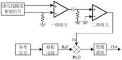 In the above embodiment, as shown in fig. 5, the signal processing module includes a first-stage amplifying module, a second-stage amplifying module, a phase-locked amplifying module, and a low-pass filtering module. The signal processing module is connected with the output end of the sensor induction coil. After the output signal of the induction coil is accessed to the signal processing module, the primary amplification module amplifies the signal by 500 times, the amplified and output signal is accessed to the secondary amplification module again, the signal is amplified by 20 times, the output signal is processed by the phase-locked amplification module, wherein a reference signal (Ref) amplified by phase locking is obtained by shifting an excitation signal, and finally the reference signal is transmitted to the signal acquisition module through low-pass filtering.