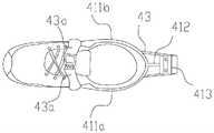 具体的,包括:鞋后支架41,所述鞋后支架41包括夹持部411,所述夹持部411呈双手抱合状夹持在鞋子的后侧,与鞋子的后侧型状相适配,所述夹持部411背离鞋子的一侧向外延伸形成一加长力臂412;还包括一绷紧机构43,用于将所述鞋后支架41固定在鞋子上。Specifically, it includes: a shoe