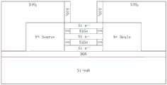 首先,在SOI(Silicon On Insulator,绝缘层上的硅)片上通过外延方式依次生长SiGe,掺杂硼的Si层;其中,掺杂硼的Si层决定了后续纳米线根数;掺杂硼的Si层至少为一层。在本实施方式中,SiGe层为牺牲层,掺杂硼的Si层为沟道层。形成叠层之后,其结构如图9所示。为了将叠层的形状制备为符合器件要求的形状,需要对叠层进行光刻和刻蚀,刻蚀的方式例如可以采用干法刻蚀。刻蚀完成后,形成沟道叠层,其结构如图10所示。通过沉积膜层,例如多晶硅膜层,以及对多晶硅膜层的刻蚀,形成假栅。再次沉积膜层,例如二氧化硅膜层,以及对二氧化硅膜层的刻蚀,形成第一侧墙,形成第一侧墙后的结构如图11所示。在形成第一侧墙之后,对牺牲层进行刻蚀,形成向内的凹陷结构,如图12所示。在形成凹陷结构之后,通过沉积膜层,例如氮化硅膜层,以及对氮化硅膜层的刻蚀,形成第二侧墙,形成第二侧墙之后的结构如图13所示。在侧墙的形成过程中,可以采用高选择比的各向异性刻蚀方式进行刻蚀,在刻蚀的过程中,水平平面上的膜层会被快速刻蚀掉,而竖直平面上的膜层将以较慢的速率被刻蚀掉。在形成第二侧墙之后,对器件进行介质填充,例如可以采用二氧化硅进行填充,填充完成后,对介质进行光刻刻蚀,暴露出源极区域,其结构如图14所示。在暴露出源极区域之后,在源极区域通过原位掺杂方式外延掺杂B离子的SiGe,形成源极,其结构如图15所示。采用与源极的形成方式类似的方式,对器件进行介质填充后,对漏极区域进行光刻刻蚀,暴露出漏极区域,其结构如图16所示。在暴露出漏极区域之后,在漏极区域通过原位掺杂方式外延SiGe-P形成漏极,其结构如图17所示。在形成漏极后,对源极区域的介质进行去除,其结构如图18所示。在形成源漏之后,对器件进行介质填充并平坦化,例如采用化学机械研磨的方式进行平坦化,打开假栅顶部的二氧化硅膜层。再采用刻蚀的方式对假栅进行去除,例如可以采用湿法刻蚀的方式对假栅进行去除。去除假栅后的结构如图18所示。在完成上述的步骤之后,牺牲层被暴露出来,此时可以对牺牲层进行刻蚀,刻蚀方式例如可以为干法刻蚀、湿法原子层刻蚀或者氯化氢气体反应的方式进行刻蚀。刻蚀完成后,假栅和牺牲层所占用的空间形成空腔,其结构如图19所示。再在假栅和牺牲层所在空间内生长高K介质金属栅,即形成环形介质金属栅,其结构如图20所示。完成上述的步骤之后,再形成膜层,例如二氧化硅介质膜层,对介质膜层开孔再形成金属塞,即可形成最终的器件。器件结构如图21所示。First, on the SOI (Silicon On Insulator, silicon on insulating layer) wafer, SiGe and boron-doped Si layers are grown sequentially by epitaxy; among them, the boron-doped Si layer determines the number of subsequent nanowires; the boron-doped Si layer determines the number of subsequent nanowires; The Si layer is at least one layer. In this embodiment, the SiGe layer is a sacrificial layer, and the boron-doped Si layer is a channel layer. After the stack is formed, its structure is shown in FIG. 9 . In order to prepare the shape of the laminate into a shape required by the device, it is necessary to perform photolithography and etching on the laminate, and the etching method may be, for example, dry etching. After the etching is completed, a channel stack is formed, the structure of which is shown in FIG. 10 . The dummy gate is formed by depositing a film layer, such as a polysilicon film layer, and etching the polysilicon film layer. A film layer, such as a silicon dioxide film layer, is deposited again, and the silicon dioxide film layer is etched to form a first side wall. The structure after forming the first side wall is shown in FIG. 11 . After forming the first sidewall, the sacrificial layer is etched to form an inward recessed structure, as shown in FIG. 12 . After the concave structure is formed, a second side wall is formed by depositing a film layer, such as a silicon nitride film layer, and etching the silicon nitride film layer. The structure after forming the second side wall is shown in FIG. 13 . In the formation process of the side wall, anisotropic etching method with high selectivity can be used for etching. During the etching process, the film layer on the horizontal plane will be quickly etched away, while the film layer on the vertical plane The film layer will be etched away at a slower rate. After forming the second sidewall, the device is filled with a dielectric, for example, silicon dioxide can be used for filling. After the filling is completed, the dielectric is etched by photolithography to expose the source region, and its structure is shown in FIG. 14 . After the source region is exposed, SiGe doped with B ions is epitaxially doped in the source region by in-situ doping to form the source, the structure of which is shown in FIG. 15 . In a manner similar to that of the source electrode, after the device is filled with a dielectric, the drain region is photolithographically etched to expose the drain region, and its structure is shown in FIG. 16 . After the drain region is exposed, epitaxial SiGe-P is formed in the drain region by in-situ doping to form the drain, and its structure is shown in FIG. 17 . After the drain is formed, the dielectric in the source region is removed, and its structure is shown in FIG. 18 . After the source and drain are formed, the device is filled with a dielectric and planarized, for example, by means of chemical mechanical polishing, to open the silicon dioxide film layer on the top of the dummy gate. The dummy gate is then removed by etching, for example, the dummy gate may be removed by wet etching. The structure after removing the 