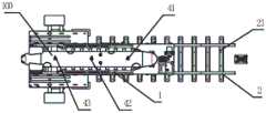 在上述实施方案的基础上,参见图9至图11,牵引组件2包括固定铺设在船体上的轨道21,轨道21的长度方向为船体长度方向一致;在轨道22上架设牵引车22,牵引车22承载平台支架1,翻转机构3设置在牵引车22和平台支架1之间,牵引车22通过翻转机构3与平台支架1连接。牵引车22自身具备动力系统,可以沿轨道21运动。本方案仅为实施方案中的一种,并不仅限于轨道和轨道车的结构实施形式,只需满足可以平稳带动平台支架1移动即可。因为考虑到监测平台100自身性质的特殊性,因此选用了这结构,具有更好的承重力。On the basis of above-mentioned embodiment, referring to Fig. 9 to Fig. 11,
