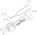 所述第三驱动绳1-3和第四驱动绳1-4在第二电机9-2轴的输出轴上的缠绕方向相反,所述第一固丝扣8-1固定设置于所述第一夹持钳7-1上,所述第三驱动绳1-3和第四驱动绳1-4分别位于所述第一固丝扣8-1相对的两端。The winding directions of the third drive rope 1-3 and the fourth drive rope 1-4 on the output shaft of the second motor 9-2 are opposite, and the first fixed thread buckle 8-1 is fixedly arranged on the second motor 9-2. On a clamping pliers 7-1, the third driving rope 1-3 and the fourth driving rope 1-4 are respectively located at opposite ends of the first fastening thread 8-1.