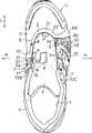 As Fig. 3~shown in Figure 5, along theedge part 35 of above-mentionedsecond opening 2 of above-mentioned vamp U, be disconnected in the position corresponding with each pars contractilis 50,51, like this,form notch 63,64.That is, on the position corresponding, be provided withinner incision portion 63, be provided withoutside notch 64 at the outside of above-mentionededge part 35 pars contractilis 50 with the inboard pars contractilis 51 of above-mentioned edgepart 35.Notch 63,64 is arranged to not give prominence to (included) from theedge part 35 ofvamp.Form notch 63,64 by the inboard and the outside, make near vamp U partsecond opening 2 become and be easy to bending, like this, significantly improved the bendability of footwear at pin.