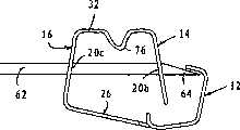 [0029]仍然参考图4,当针夹10扩张并且第二和第三接合臂14、16如上所述的移动时,位于第二和第三接合臂14、16上的开口20b、20c从大致圆横截面投影为大致椭圆形横截面。可选地,开口20b、20c根据起始角度可以从较小的椭圆形横截面投影为相对较大的椭圆形横截面。在准备位置和激活位置之间转换的过程中,每个开口20b、20c的上和下部分接触针62的外表面并且通过对应于由[θ′1:θ1];[θ′2:θ2]之间的差所限定的偏压或负载的作用力及针夹10的弹力楔靠在外表面上,所述弹力受到所选定的特殊材料及所使用厚度的影响。在一个示意性的实施例中,由开口20b、20c作用在针的外表面上的作用力的数值是如此的使得弹簧夹10保持牢固固定到针上并且针尖64相对于第一接合臂12的进一步向近端的移动受到限制。优选地,这种限制足以承受作用在针62上将针相对于针夹10拔出的正常回缩力。在示意性的实施例中,通过提供相对强硬的弹簧夹诸如通过使用不同材料,通过选择更厚的材料,或通过结合附加的偏压装置可以增加这种限制,如下文进一步讨论的。然而,作用在针上相对于针夹10的有目的的回缩力仍然可以克服开口20b、20c和针外表面之间的摩擦力并且造成针夹10与针62分开。[0029] Still referring to FIG. 4, when the