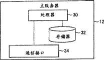 如图3所示,主服务器12具有处理器(信息处理设备注册器registrar;元素指定信息注册器;元素指定信息提供器;记录介质标识符候选呈现器;元素候选提供器)30,存储器32,以及通信接口34。处理器30写入数据到存储器32或从其中读取数据,以及通过通信接口34执行通信。有一个存储在存储器32中的数据库,其包括涉及使用游戏设备18的多个用户的各种信息集的集合(例如,对应玩家标识符,相应于每个玩家的过程数据集)。通信接口34传送信号以能够与互联网16通信。 As shown in FIG. 3 , the