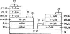 下面参考图2D,去除第一P+GaN层66的一部分和N-GaN层64的一部分,在第一P+GaN层的第一部分66A和第二部分66B之间以及N-GaN层的第一部分64A和第二部分64B之间产生开口76。开口76具有的宽度小于开口74的宽度,由此第一P+GaN层66的第一部分66A留有露出的表面78。Referring now to FIG. 2D, a part of the first P+